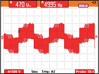50 Hz馬達(dá)驅(qū)動輸出電壓的脈寬調(diào)制信號的細(xì)節(jié)。1000V,手持萬用表,50 微秒的脈沖即導(dǎo)致某些測試設(shè)備的不穩(wěn)定。