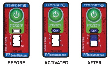 TempDot™Plus標(biāo)簽應(yīng)存儲在室溫下,,并必須在反應(yīng)溫度閾值以上被激活。激活是通過用手指推壓。"On"字出現(xiàn)在第一個窗口中顯示激活。之后5分 鐘內(nèi),在反應(yīng)溫度或低于反應(yīng)溫度的情況下將標(biāo)簽貼到產(chǎn)品上。藍(lán)色染料熔化并以控制的速率遷移,經(jīng)過白色大窗口。這表示暴露在溫度閾值以上的累計時間。當(dāng)溫 度低于閾值時,,該染料固化并停止移動。如果溫度超過閾值,TempDot®Plus標(biāo)簽提供即時的視覺跡象。