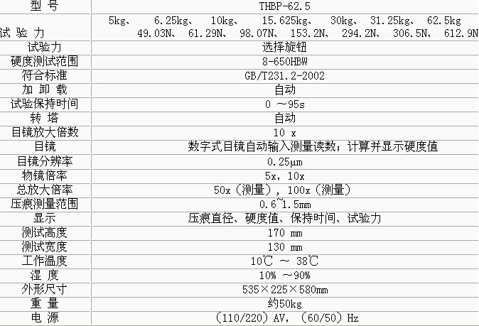 產(chǎn)品概述: THBP-62.5數(shù)顯小負(fù)荷布氏硬度計(jì)是光機(jī)電一體化的高新技術(shù)產(chǎn)品,濰坊布氏硬度計(jì)生產(chǎn)廠家,它造型新穎、美觀,山東萊州布氏硬度計(jì),具有良好的直觀性、可操作性和可靠性,布氏硬度計(jì) 價(jià)格,是測(cè)試小負(fù)荷布氏硬度的理想產(chǎn)品。 功能特點(diǎn): 1 、 儀器具備7級(jí)試驗(yàn)力,8種測(cè)試的布氏標(biāo)尺任意選擇; 2、具備了5x 和10x 兩組物鏡,布氏硬度計(jì)操作視頻,且都能參與測(cè)量; 3、物鏡和壓頭間智能式自動(dòng)切換; 4、預(yù)置試驗(yàn)力保持時(shí)間、調(diào)節(jié)測(cè)量光源的強(qiáng)弱功能; 5、自動(dòng)顯示測(cè)量壓痕長(zhǎng)度、硬度值、測(cè)量次數(shù)等;帶熱敏打印機(jī)。 6、硬度測(cè)試結(jié)果打印輸出,RS232超級(jí)終端設(shè)置,硬度計(jì)價(jià)格,供用戶擴(kuò)展功能。 7、硬度計(jì)還可根據(jù)用戶特殊需求配置CCD裝置、視屏測(cè)量裝置和攝像裝置。 8、本儀器采用精密的結(jié)構(gòu)設(shè)計(jì),進(jìn)口布氏硬度計(jì),試驗(yàn)力施加由力值傳感器控制,華銀硬度計(jì),使整機(jī)結(jié)構(gòu)緊湊,加卸試驗(yàn)力時(shí)平穩(wěn)、準(zhǔn)確。在電氣上由CPU控制試驗(yàn)過(guò)程,布氏硬度計(jì)說(shuō)明書(shū),物鏡和壓頭采用智能式自動(dòng)切換,東莞硬度計(jì),切換定位采用機(jī)械與電子雙重配合,萊州布氏硬度計(jì),使定位精度更高。 9、本儀器適用于測(cè)量鑄鐵、有色金屬及合金材料,各種退火、調(diào)質(zhì)處理后的鋼材。特別是較軟的金屬如:鋁、鉛、錫等材料測(cè)試的硬度值更正確。 技術(shù)參數(shù):